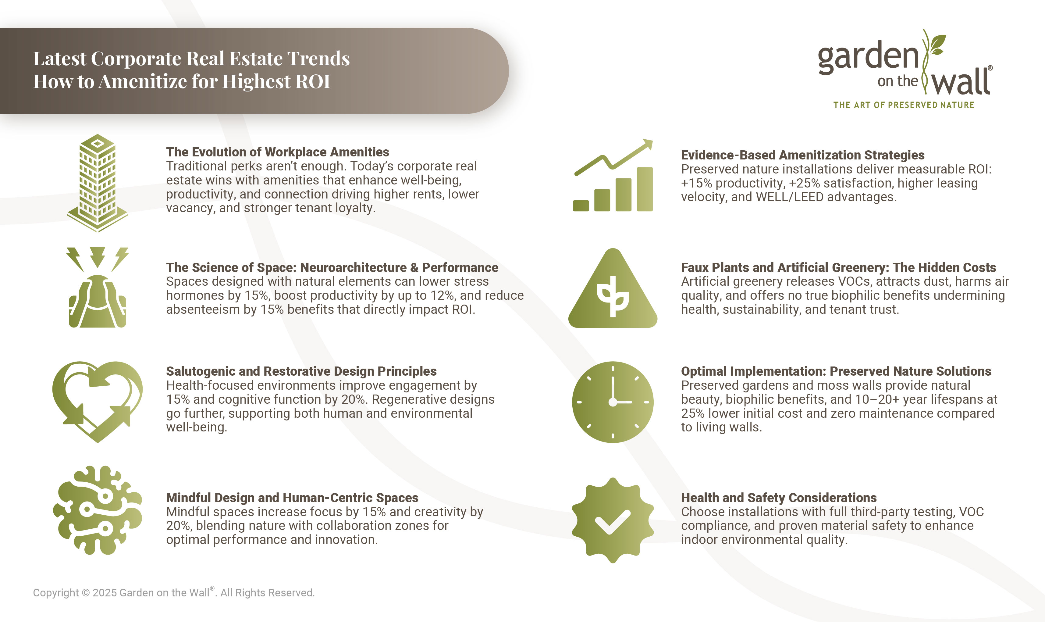 By implementing these strategies thoughtfully, property owners can create spaces that not only command premium rents but also foster tenant satisfaction and long-term loyalty. As the workplace continues to evolve, those who invest in evidence-based amenitization will find themselves at the forefront of the corporate real estate market, ready to meet growing demand for spaces that promote both wellness and productivity, utilizing proven and expert providers like Garden on the Wall®.