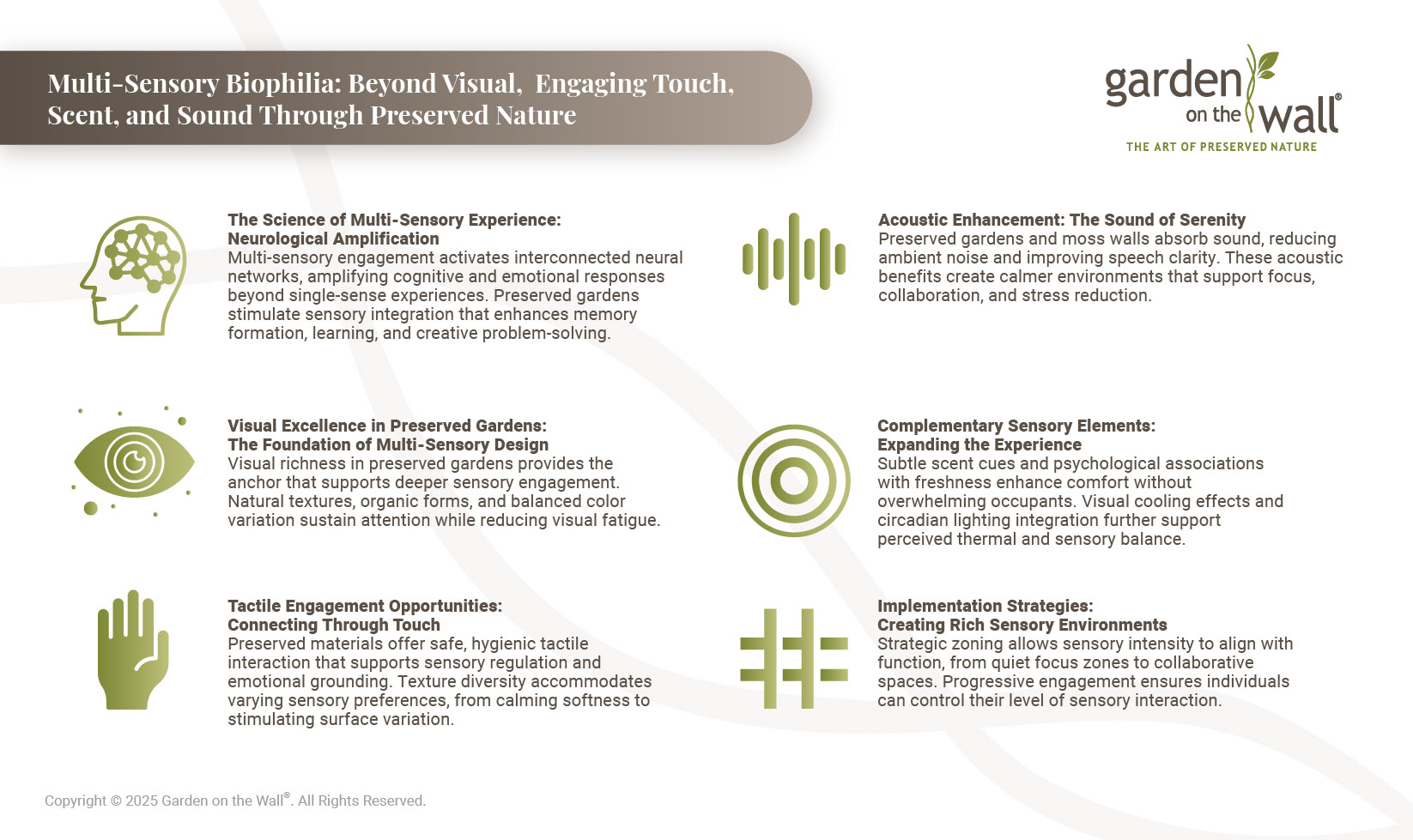 The evolution toward multi-sensory biophilic design represents sophisticated understanding of how human beings connect with natural environments. Garden on the Wall®'s preserved gardens, moss walls and planter inserts provide ideal platforms for creating rich sensory experiences that engage multiple aspects of human perception while maintaining practical advantages of maintenance-free installations.