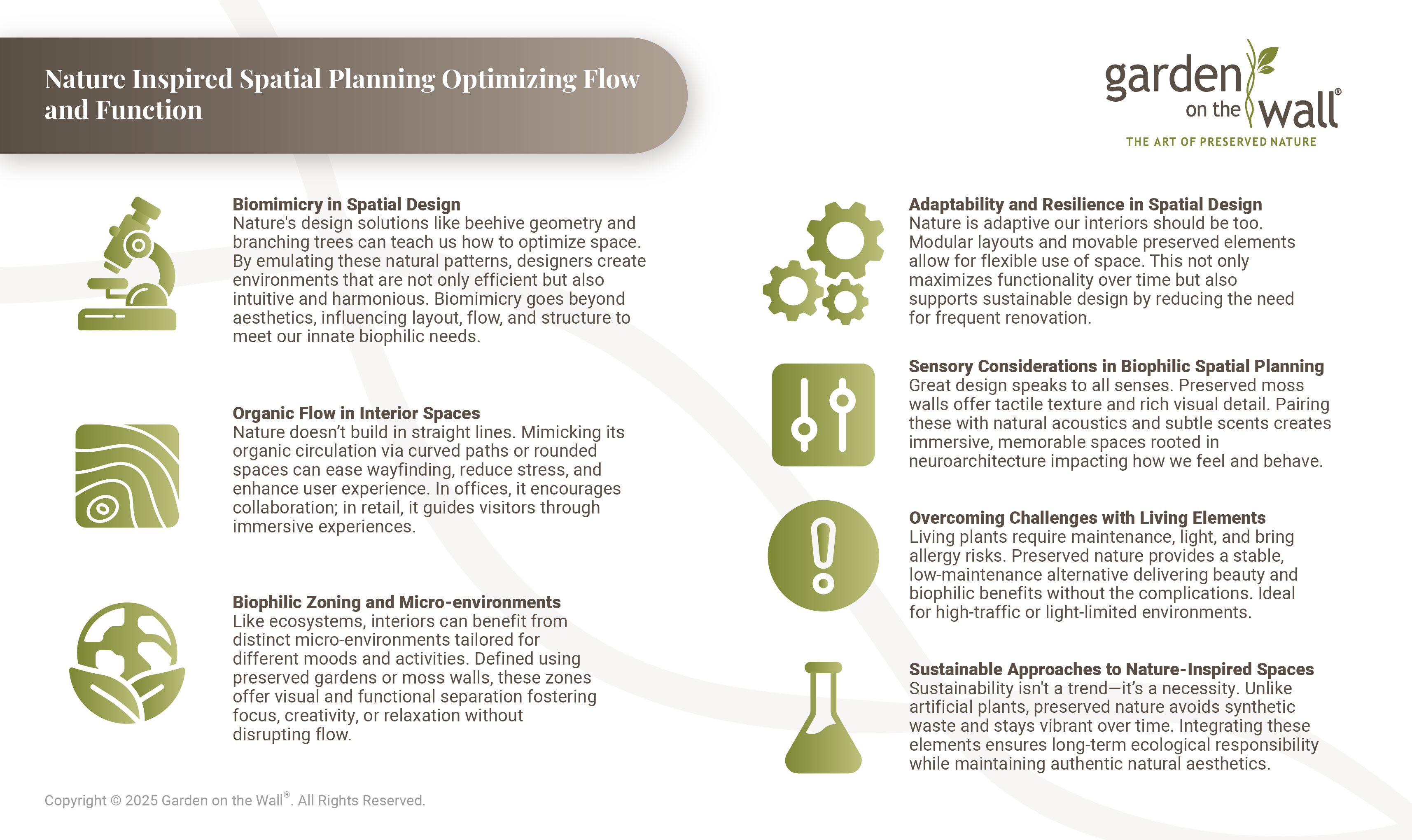 By incorporating preserved nature into spatial planning strategies, designers can create enduring biophilic environments that support both human well-being and environmental responsibility. This approach aligns with broader goals of sustainable and regenerative design, creating spaces that are not only functional and beautiful but also mindful of their long-term impact on both occupants and the planet.