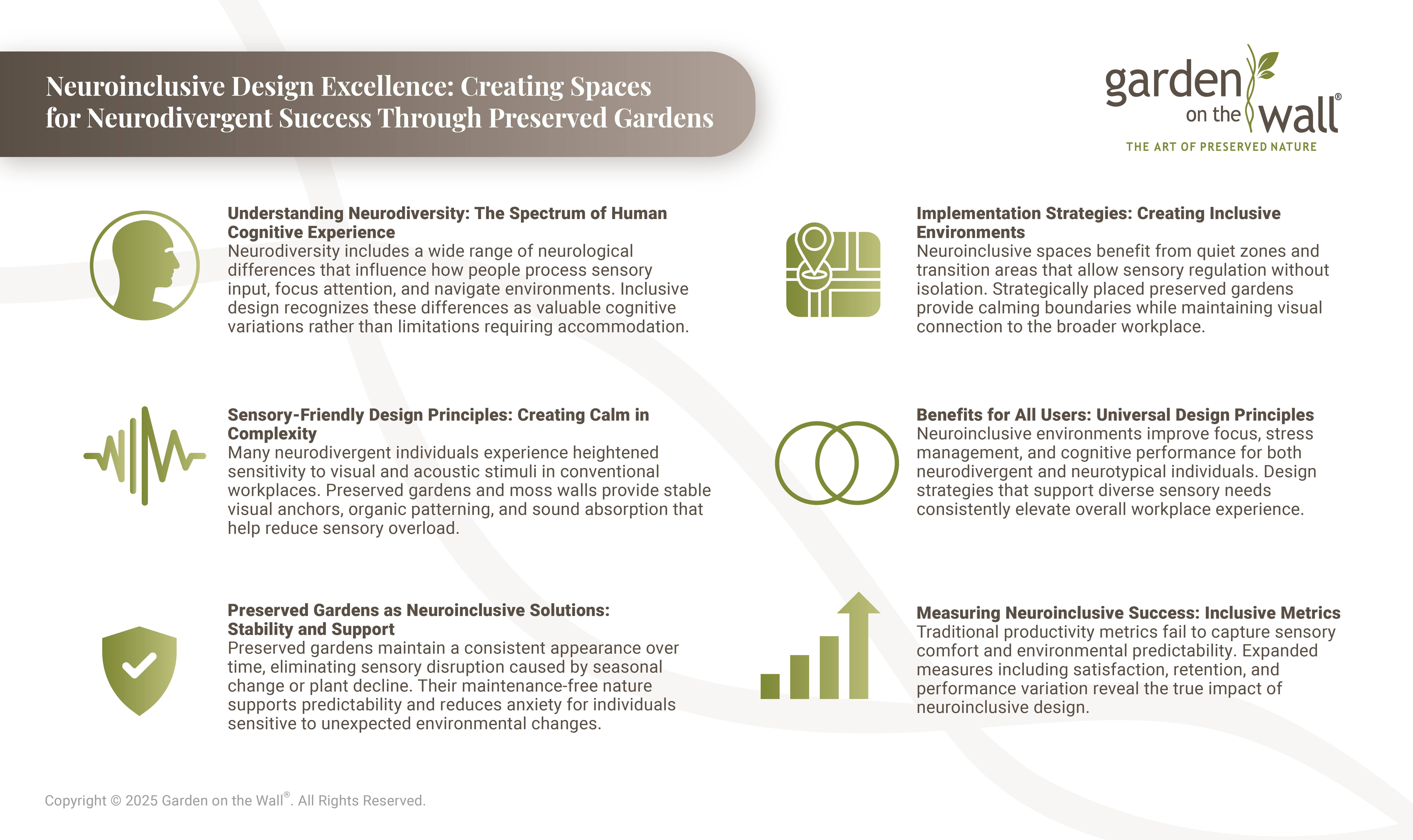 Neuroinclusive design recognizes neurological diversity as a competitive advantage rather than a constraint. Preserved gardens, moss walls, and planter inserts create stable, sensory-supportive environments that enable neurodivergent individuals to perform at their best while improving workplace conditions for everyone.