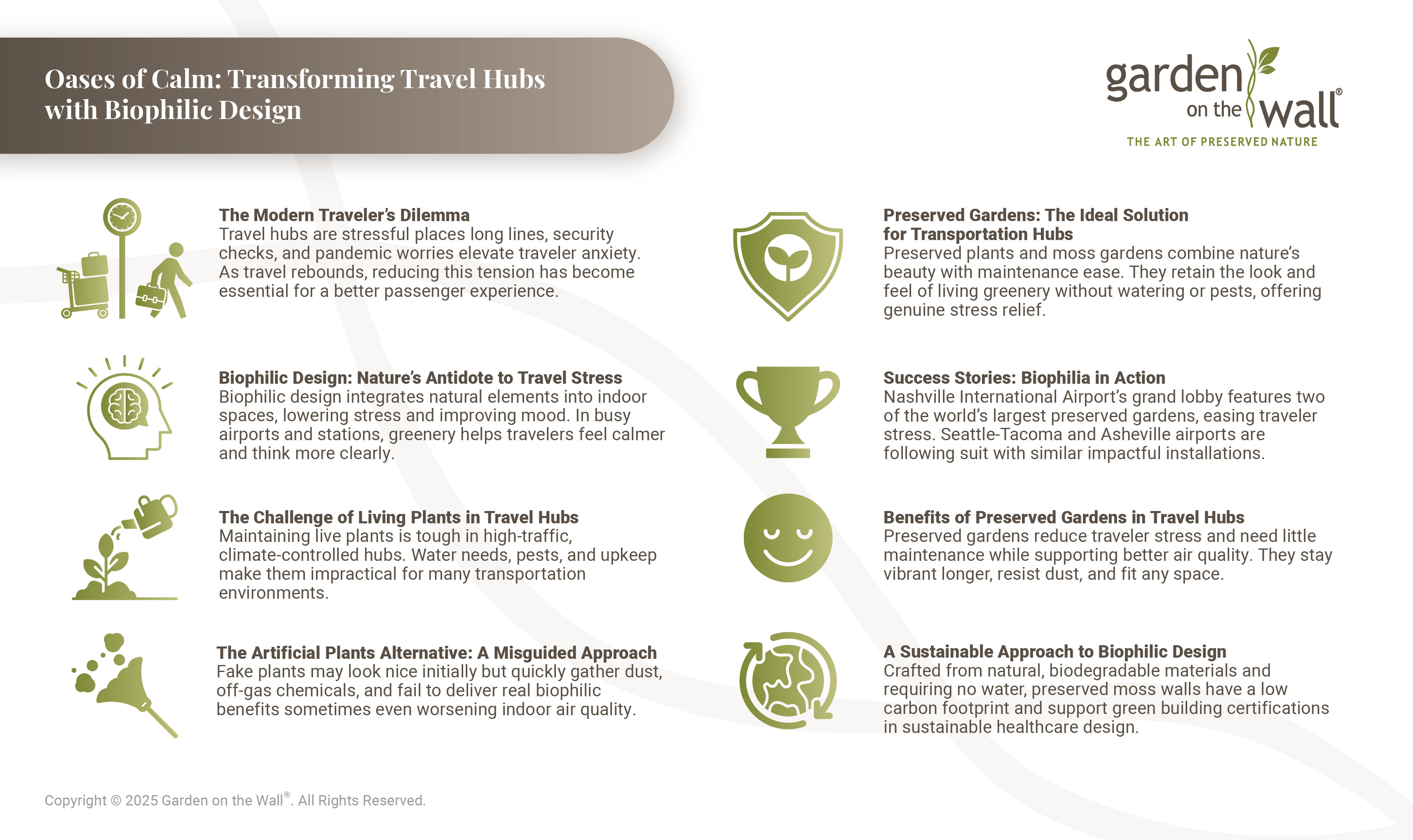As we navigate the complexities of modern travel, the importance of creating calming, human-centered spaces within our transportation hubs cannot be overstated. Biophilic design, particularly using preserved gardens, offers a powerful tool for transforming these often-stressful environments into oases of calm.