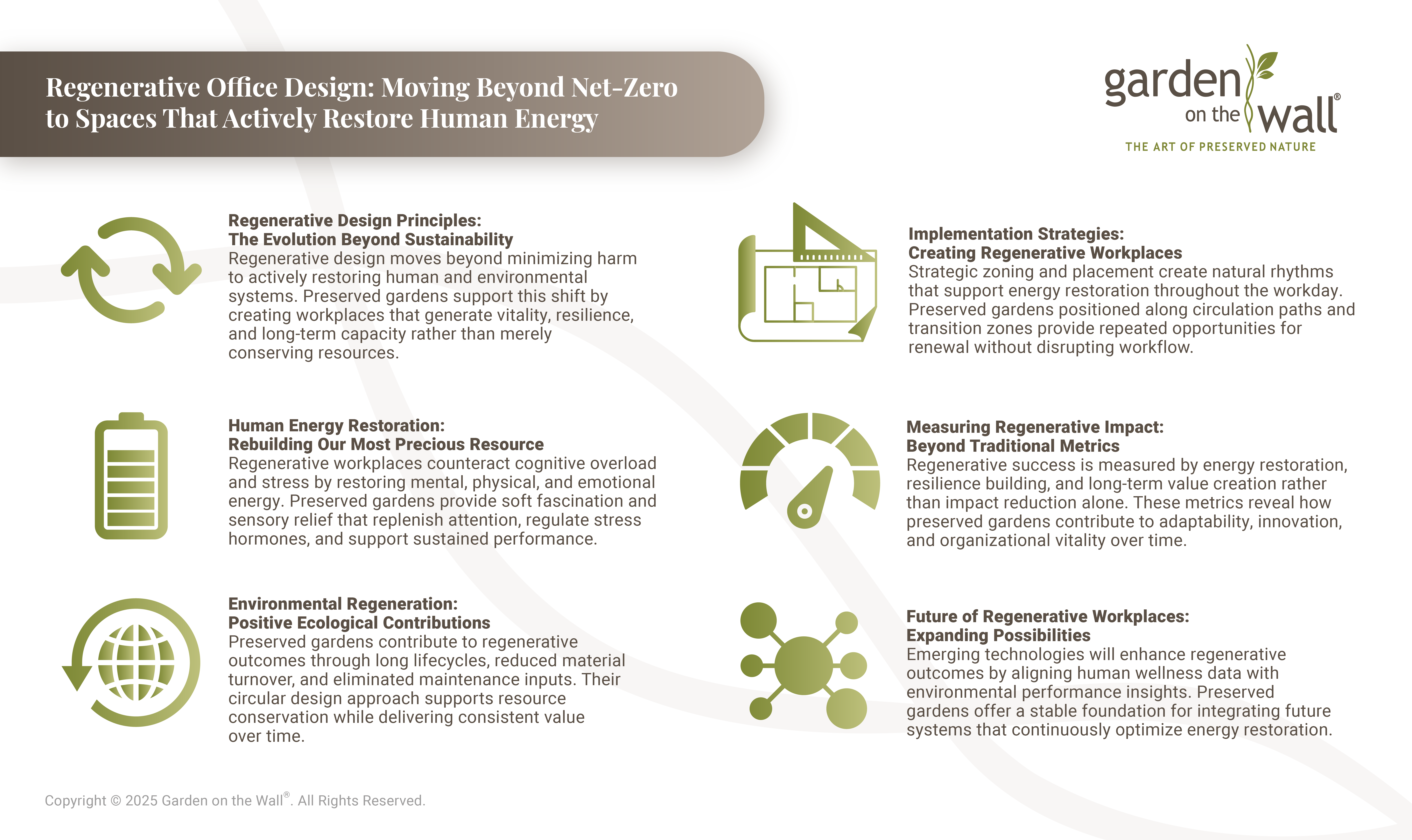 Net-zero buildings prevent environmental harm - regenerative design with preserved gardens, moss walls, and planter inserts crafted with preserved foliage actively restores both environmental and human health while creating positive impacts that compound over time. This revolutionary approach transcends sustainability's focus on "doing less bad" to embrace regenerative principles that create thriving ecosystems where human energy, organizational vitality, and environmental health mutually reinforce each other.