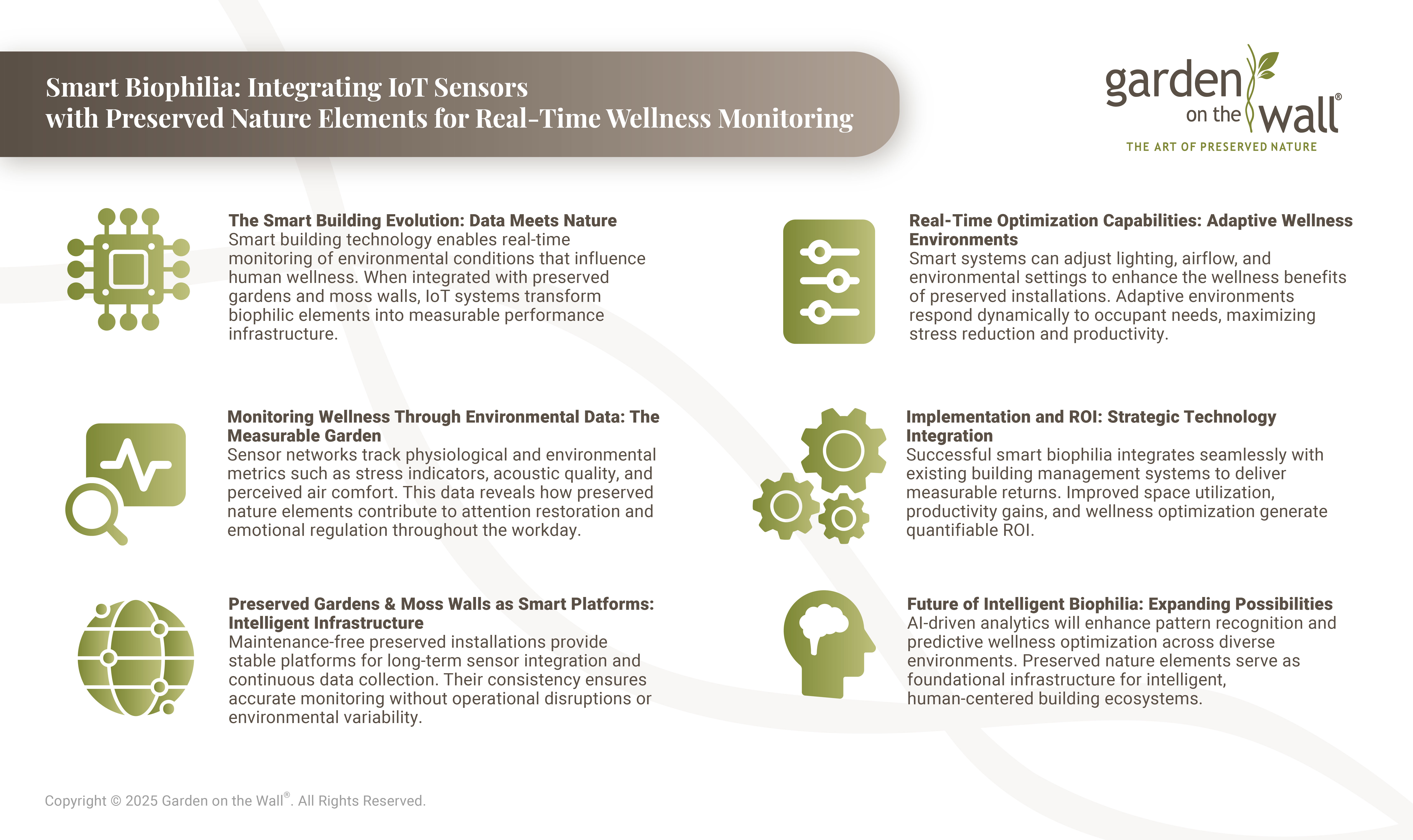 Imagine if your office walls could tell you exactly how they're improving your team's wellness in real-time. The convergence of biophilic design and smart building technology creates unprecedented opportunities to measure, optimize, and enhance wellness benefits of preserved foliage and moss walls. This data-driven approach transforms preserved nature elements into intelligent wellness platforms that continuously optimize human performance and environmental health through Garden on the Wall®'s innovative integration of traditional biophilic benefits with cutting-edge monitoring technology.