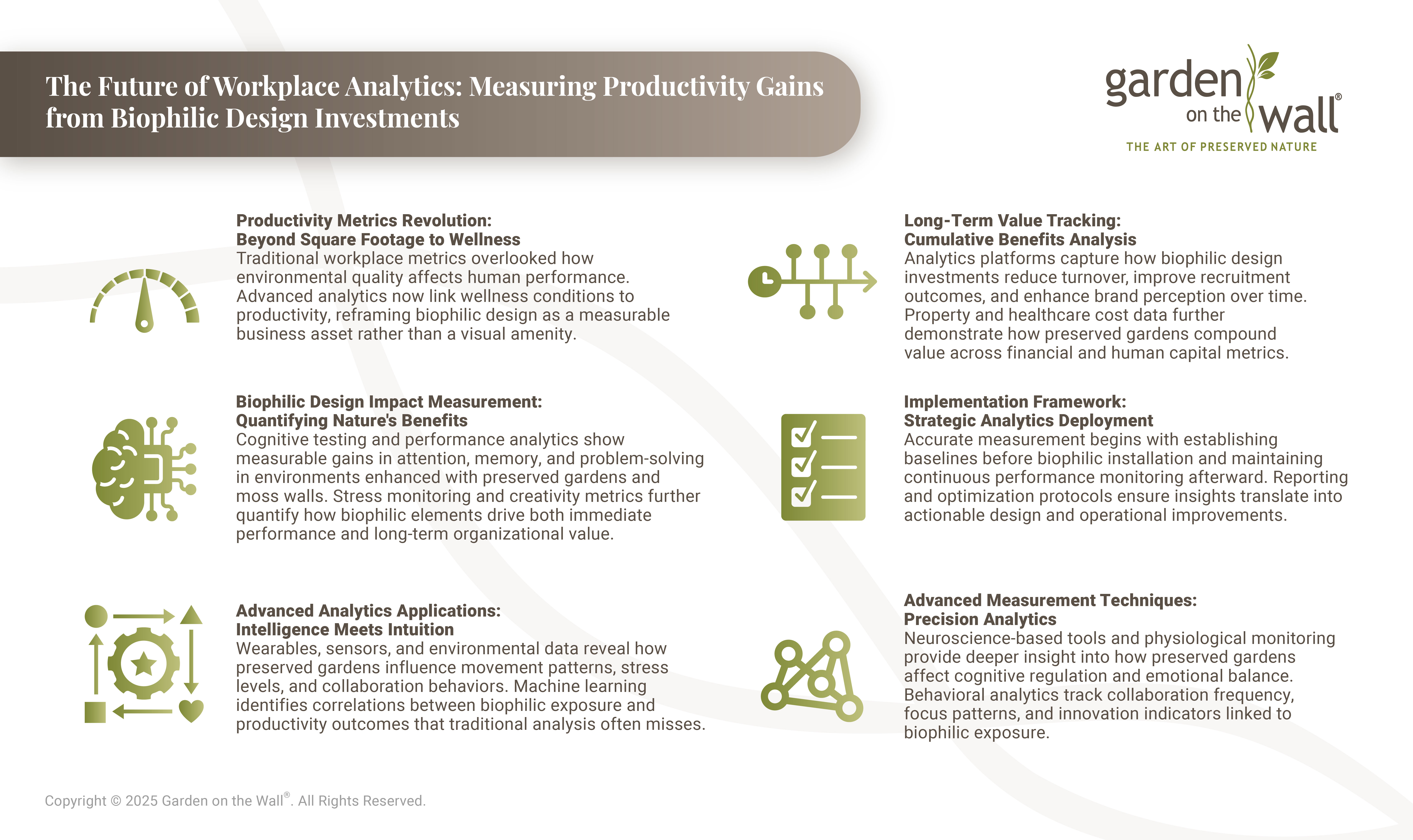 The convergence of preserved gardens and moss walls with advanced workplace analytics represents a fundamental evolution in how organizations create and manage high-performance environments. By transforming biophilic installations into measurable performance assets, analytics enable evidence-based optimization that delivers documented returns while supporting both individual flourishing and organizational success.