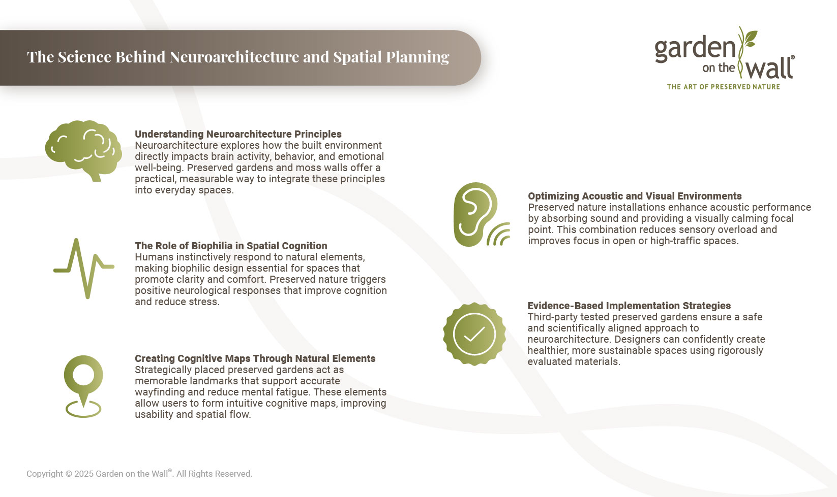 This article explains how neuroarchitecture principles combined with preserved gardens and moss walls can shape environments that improve cognitive function, reduce sensory stress, and enhance overall well-being. It highlights how evidence-based design and biophilic elements support healthier, more intuitive, and more human-centric spaces.