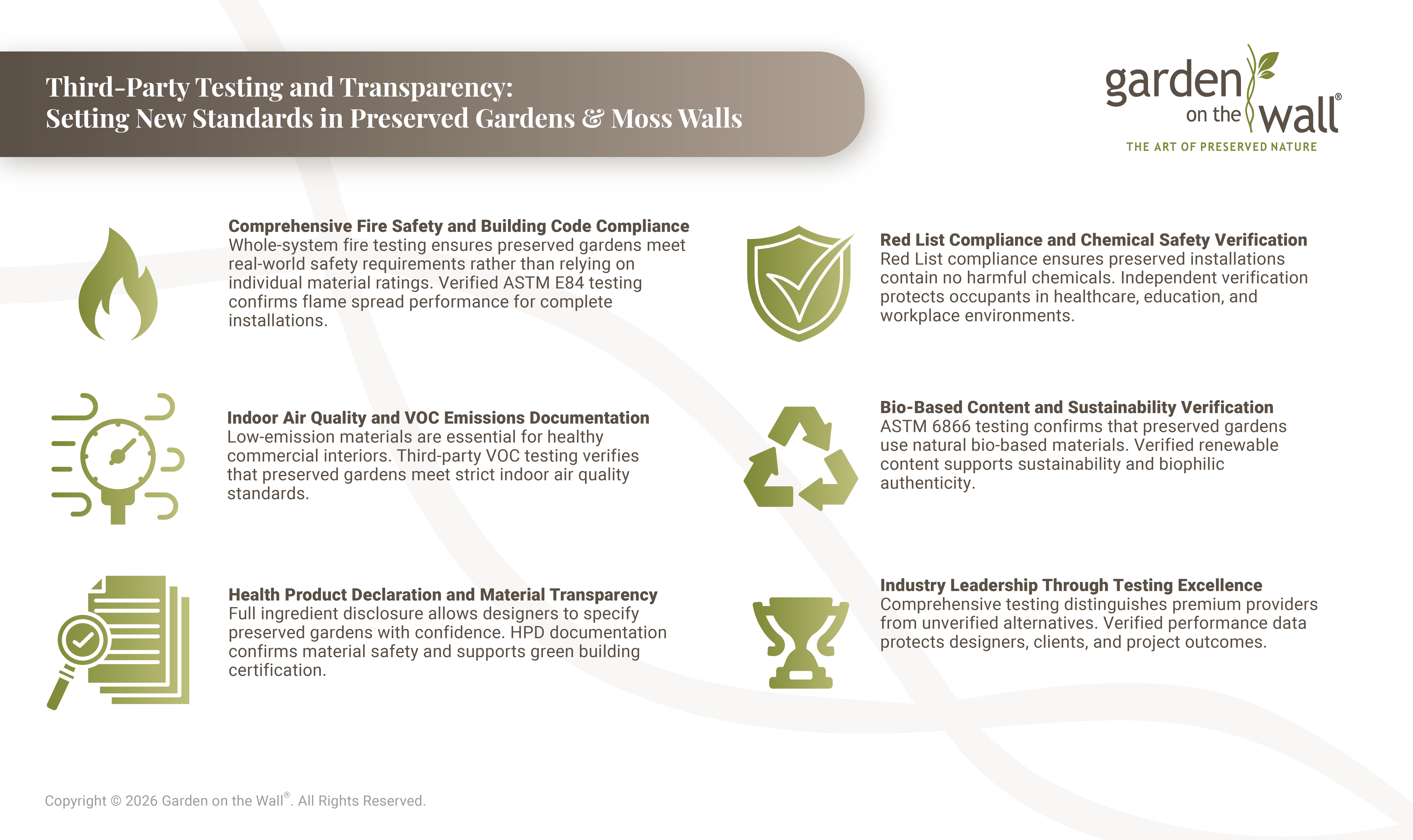 Third-party testing and material transparency are essential for specifying preserved gardens and moss walls in commercial environments. Verified fire ratings, VOC testing, and material disclosures ensure safety, performance, and long-term reliability.