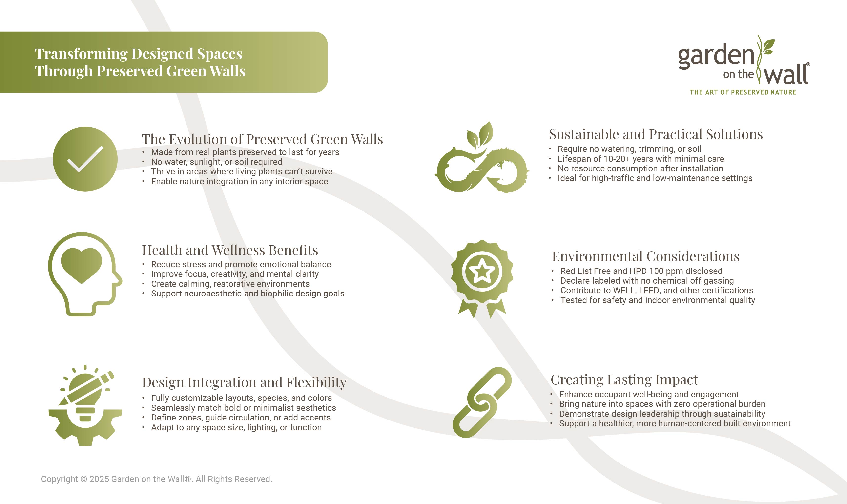 Transforming designed spaces through preserved green walls creates dramatic environmental improvements that enhance aesthetics, support wellness, and provide sustainable biophilic solutions without ongoing maintenance requirements or operational complications.