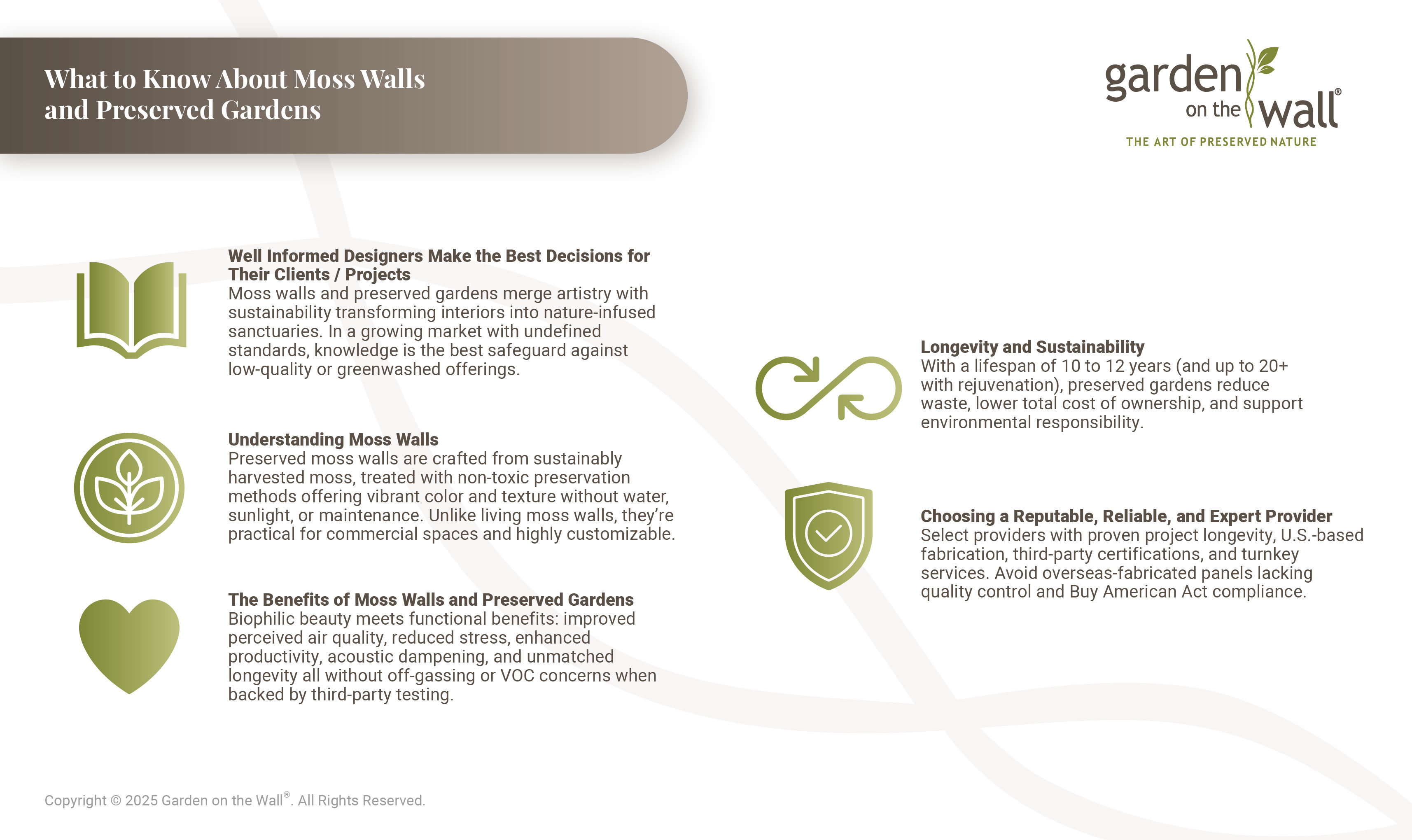 Garden on the Wall®'s moss walls and preserved gardens boast unparalleled longevity, with a proven track record of maintaining their vibrant appearance for 10-12 years or more. The company's innovative rejuvenation program can even extend the life cycle of these biophilic installations up to 20 plus years, ensuring long-term value, lowest total cost of ownership and minimal waste.