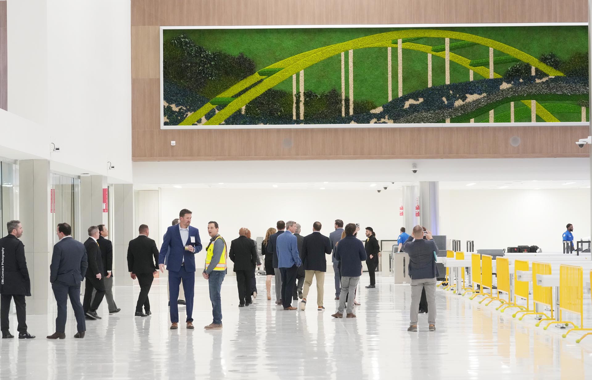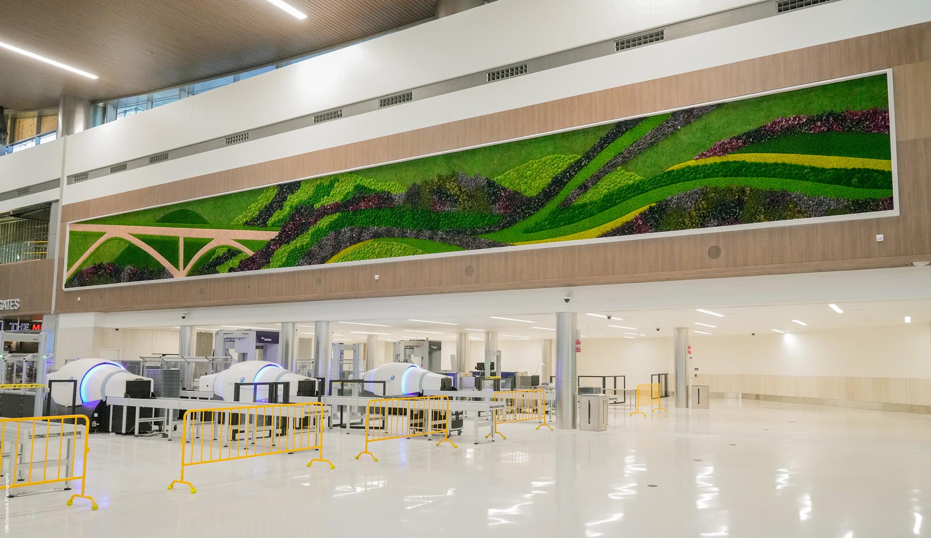 Fast forward to 2022, we had the opportunity to reconnect with the Corgan team, accompanied by the BNA curator. Their vision for the garden walls had evolved beyond simple captures of the surrounding nature. They desired artistic representations that would encapsulate Nashville's vibrant culture and diversity. Excited by the prospect, our design team eagerly delved into this endeavor. We started by immersing ourselves in understanding what Nashville and its airport symbolized for travelers, as well as comprehending Corgan's vision for the extraordinary lobby space. The goal was to seamlessly blend art and nature into two cohesive designs, intended to be showcased at the security screening area. As we looked for inspiration, we were captivated by the beautiful Cumberland River, winding through Nashville with its green banks and rolling hills. It inspired us to create vibrant gardens that celebrated the city's culture and diversity. In our first drafts, we played with abstract patterns inspired by the music of Nashville and included representations of rivers and hills. We also had an option with a preserved plant design of a local landmark, which turned out to be the favorite. During our revisions, we had a realization. We noticed the significance of two famous bridges in Nashville: the Korean Veterans Memorial Bridge and the Natchez Trace Parkway Bridge. These bridges were like anchors in the landscape, leaving a lasting impression. We thought it would be great to incorporate their essence into our artwork, seamlessly blending art, nature, and the spirit of those iconic structures.