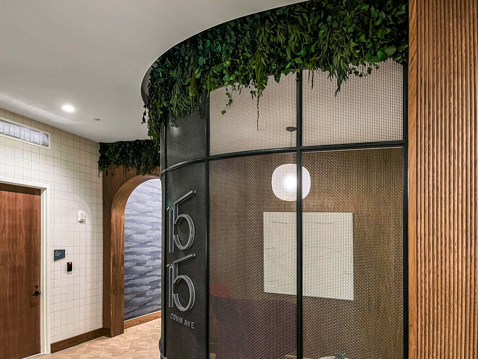 The lobby area of this chic and stylish residential rental  facility in Boston, MA features modern décor, stylish minimalist furnishings,  attractive curvature in the elevated wall, and the ultimate finishing touch  adding greenery and glamour: GOTW's overhead planter inserts. Composed of  draping forest species, the elegant gardens are a classy addition to the  space, blending in with the soft, natural millwork yet offering the visual  interest and contrast of greenery. Artistic touches like this make occupant  and visitor experiences memorable and at the same time, pleasant and  soothing. They also offers a more inclusive experience for those  neurominorities who need peace and zen in built environments, especially  after stepping in off the busy streets.