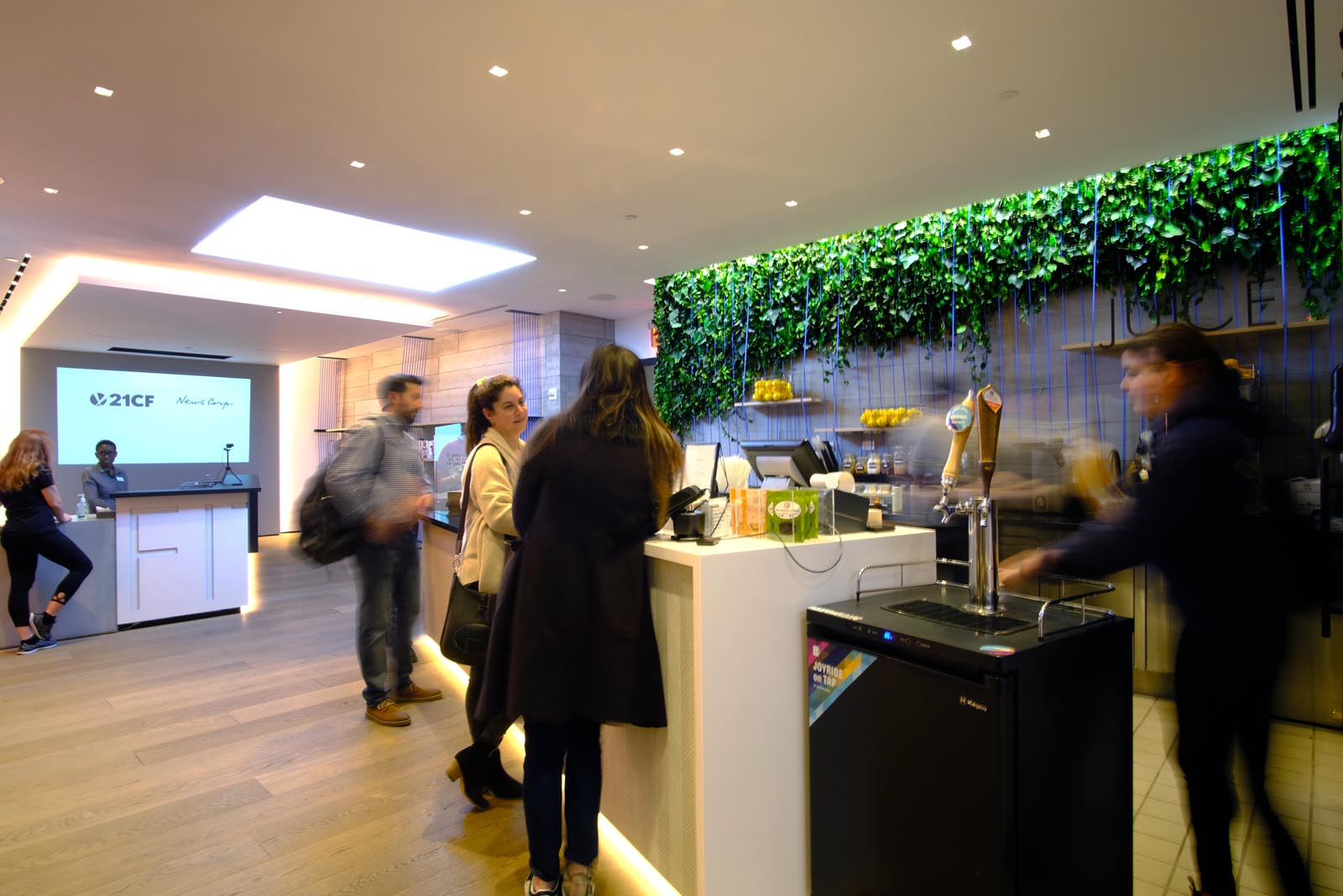 GOTW’s mesmerizing installation above the café bar in the modern NYC offices! This multinational mass media corporation is a breath of fresh air for busy employees seeking refreshment. As lush forest foliage cascades onto the back wall, the garden installation bursts with life, mirroring the revitalization employees experience with each sip of a healthy smoothie. It’s a gushing welcome, offering a dose of biophilia to kickstart the day and invigorate the corporate atmosphere. Nature’s embrace fuels creativity and rejuvenates the spirit, transforming the café into a vibrant oasis within the bustling city.