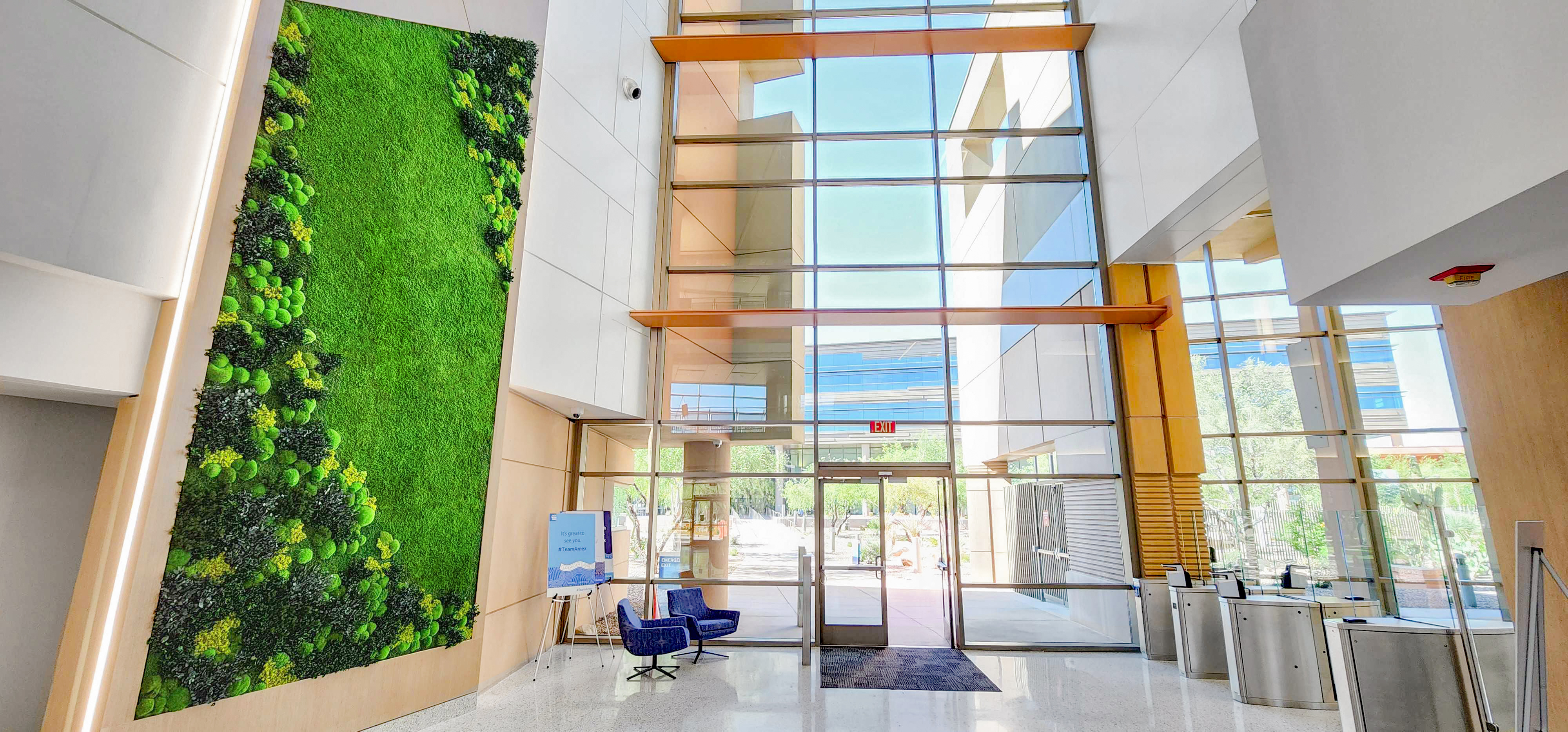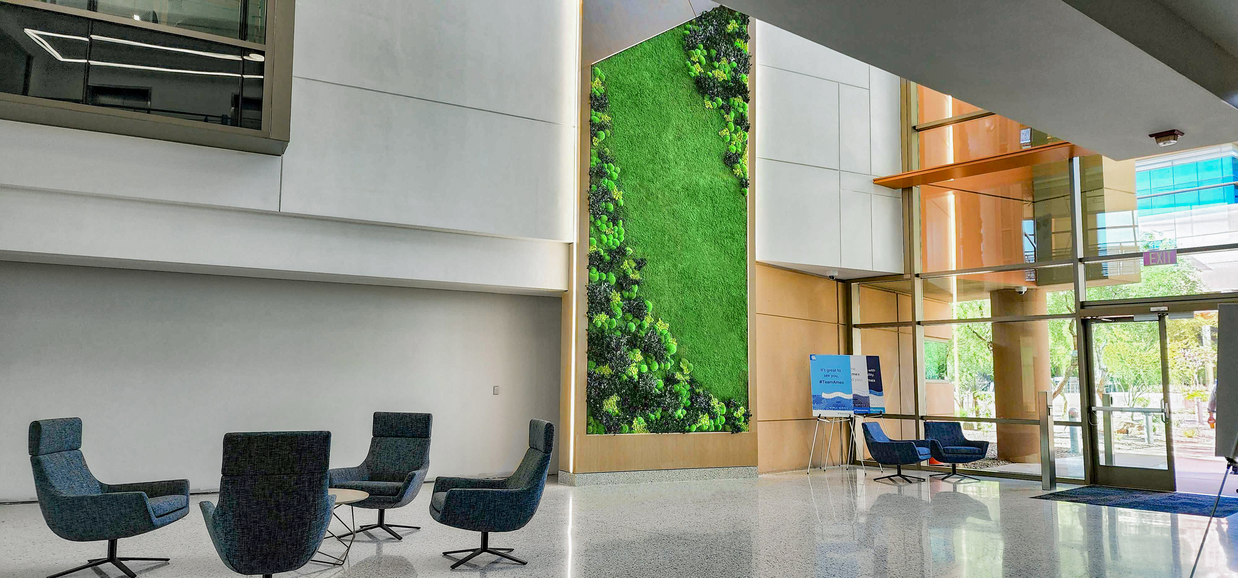 Credit Biophilia for Enlivening a Payment Card Service’s Office! In the lobby of the Phoenix, AZ offices of this global payment card services company, GOTW’s towering garden installation accentuates the height and angles of the space. Welcoming employees and visitors, the all-natural garden incorporates fern, forest, eucalyptus, and moss species resplendent in their natural colors to instill warmth and texture, as well as acoustic benefits. GOTW’s installations in workplaces bring a long list of benefits as well, from improved morale to increased productivity, which always look good in the financial ledgers.