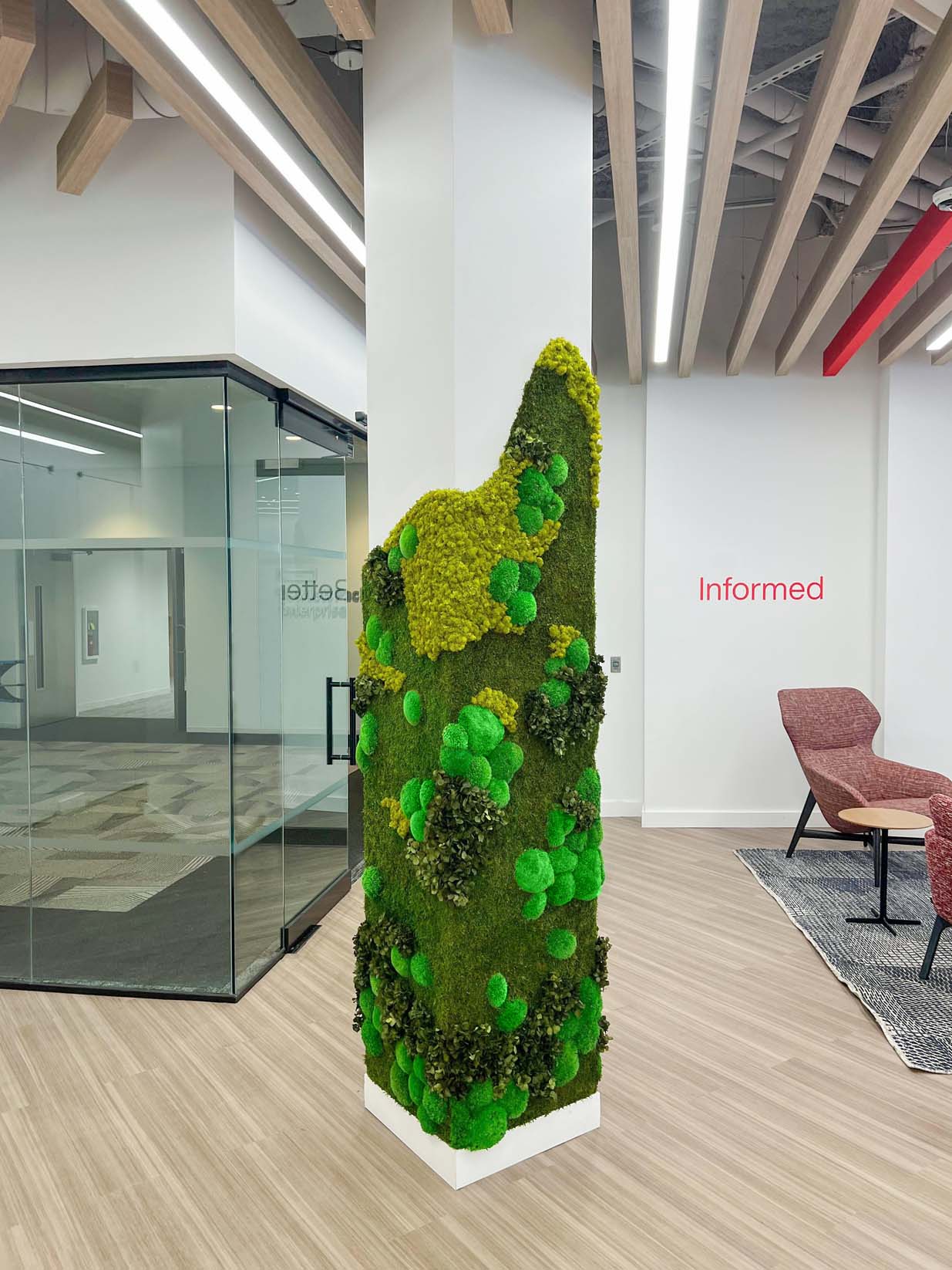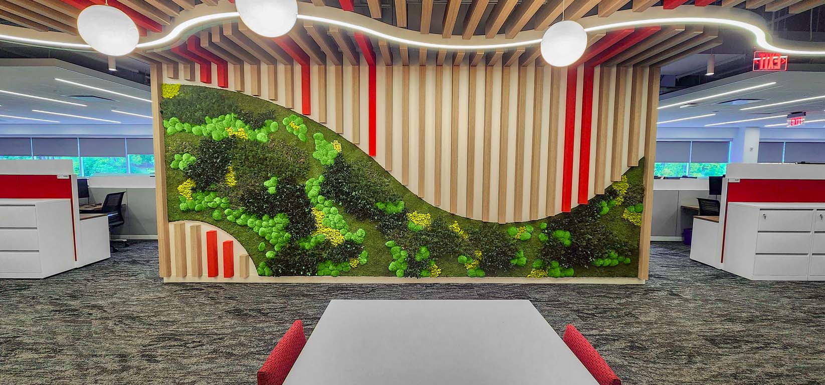 Biophilia Stays Ahead of the Curve! In the Berkeley Heights, NJ offices of this global risk management company, there is no risk of visual boredom for employees and visitors thanks to the intriguing millwork and abundant biophilia from GOTW. Including large curvilinear wave gardens along hallways and interior walls, as well as column wraps, these biodiverse installations mirror the bucolic wooded scenes outside the windows, and even go a step further in shape and form. Set amidst intriguing on-brand wooden slats accentuating the wave pattern of the gardens, these installations are sure to excite and inspire!