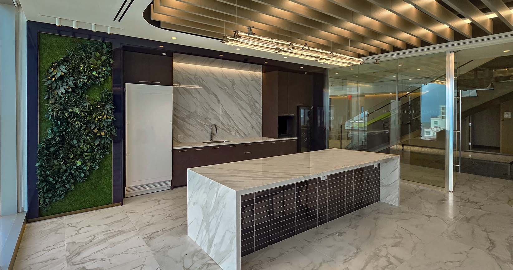 Biophilia Framing the Bay! Garden on the Wall® brought a lush biophilic presence to the café area of CI Financial’s Miami office, where employees and guests gather against the backdrop of sweeping bay views. Two installations, set within custom millwork perpendicular to the full-height windows, create a striking balance between the natural and built environment.