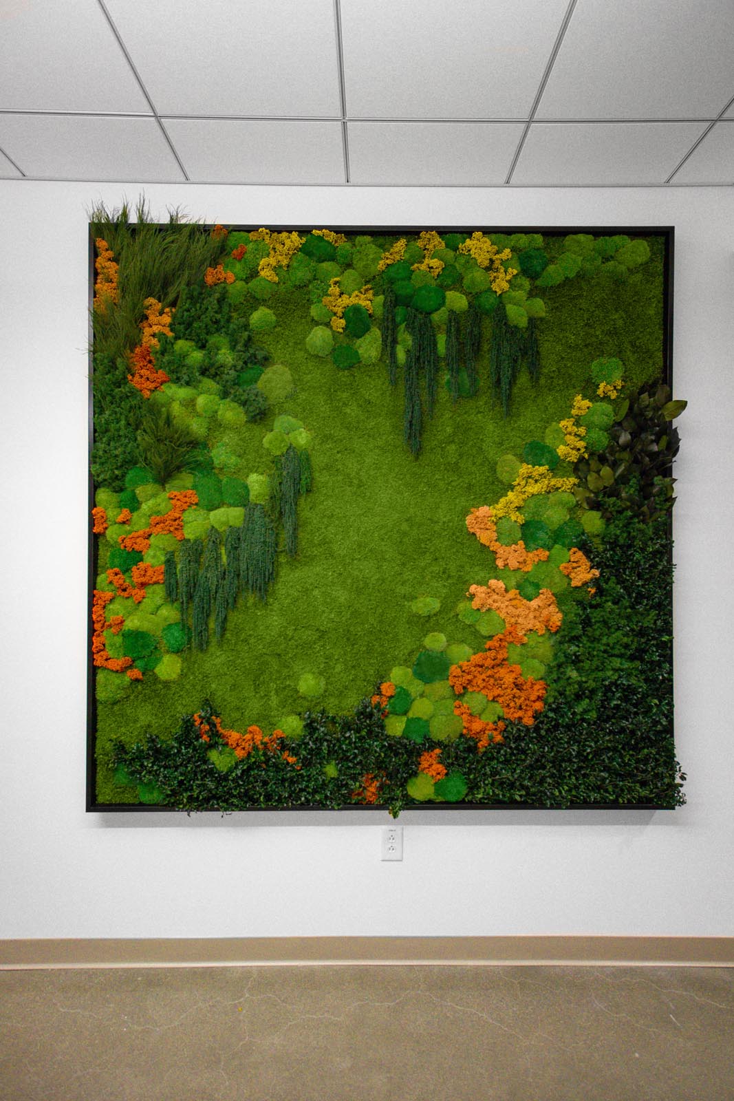 Finding Rejuvenation in the Calming Effects of Biophilia! The reception garden of this remarkable immuno-oncology therapeutics organization is enlivened by GOTW’s lush, verdant display of biodiversity.  The installation, integrated into a large frame, features a patterned presentation of forest and floral species, complementing a textured canvas of moss species. The variety of greens, combined with red floral elements aligned with the client logo, creates a calming, soothing effect in the reception area, making a subtle biophilic contribution to the commendable work being done here for the benefit of cancer patients.