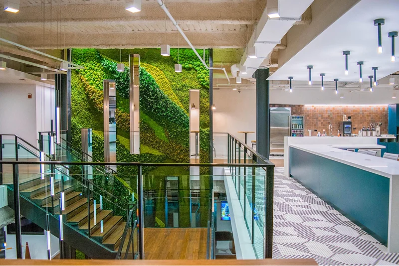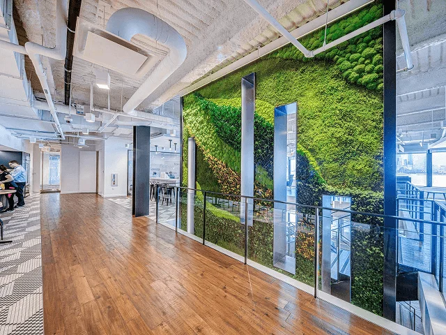Biophilia soars at the Jersey City, NJ offices of this trading, investment, and information solutions company serving the financial community! Spanning two stories, GOTW’s epic installation provides a towering Greenscape in the open, modern space, flanking the floating staircase. Not only is this very large garden impressive in its size and presence, it also features compelling cut-out windows to contribute to the openness and flow of light in the office. With a diverse portfolio of mosses with forest and flower foliage elements, GOTW’s garden is an investment in workplace productivity, rejuvenation, and positive outlook.