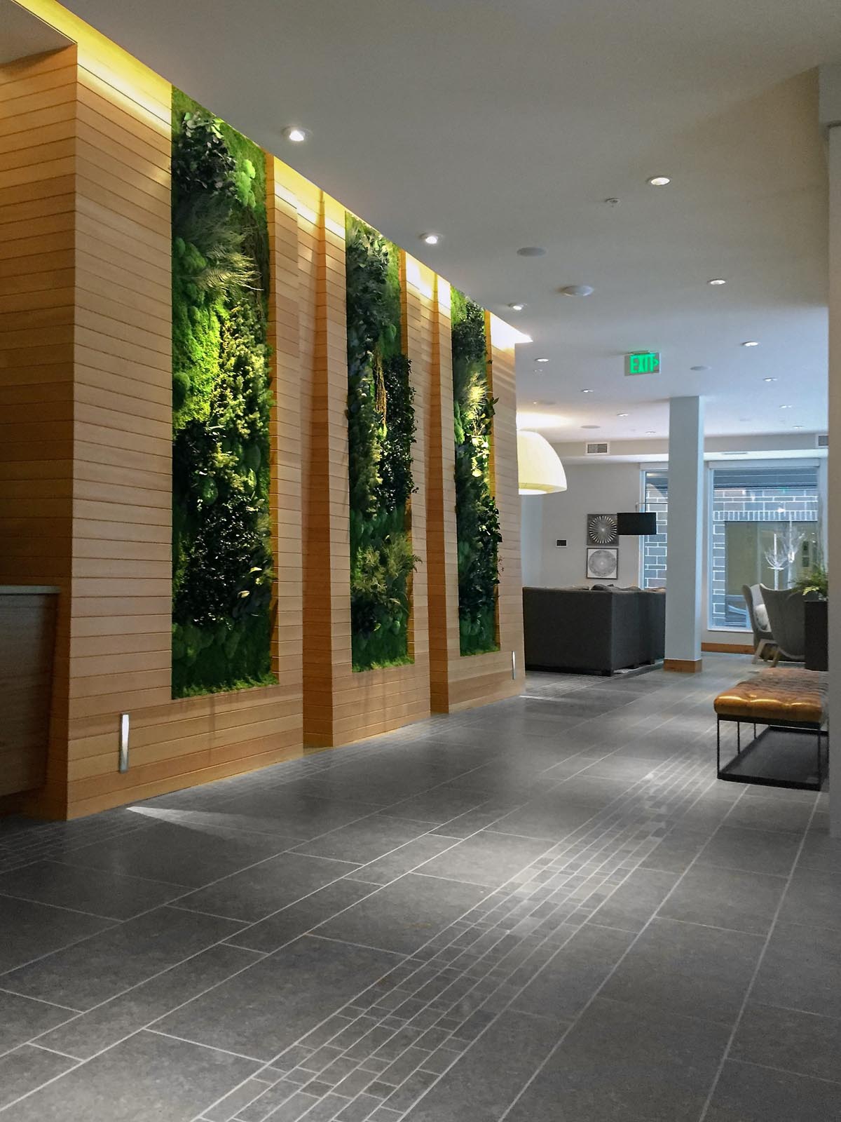 The Three Pillars of Biophilia! We could say that the three pillars of biophilia are: Natural, Sustainable, and Enduring. We could also say that GOTW’s three column installations at this modern, chic residential complex in Minnesota are biophilic pillars as well. This charming and bountiful display of biodiversity welcomes occupants and guests in the lobby space. Set into the wood paneling and creating an intriguing divider wall, these all-natural gardens feature lush forest species and moss combinations to provide a connection to outdoor nature – which, in Minnesota, is not green all year-round, like our gardens! It’s easy to see why biophilia is fast becoming the most talked about resident in this modern abode!