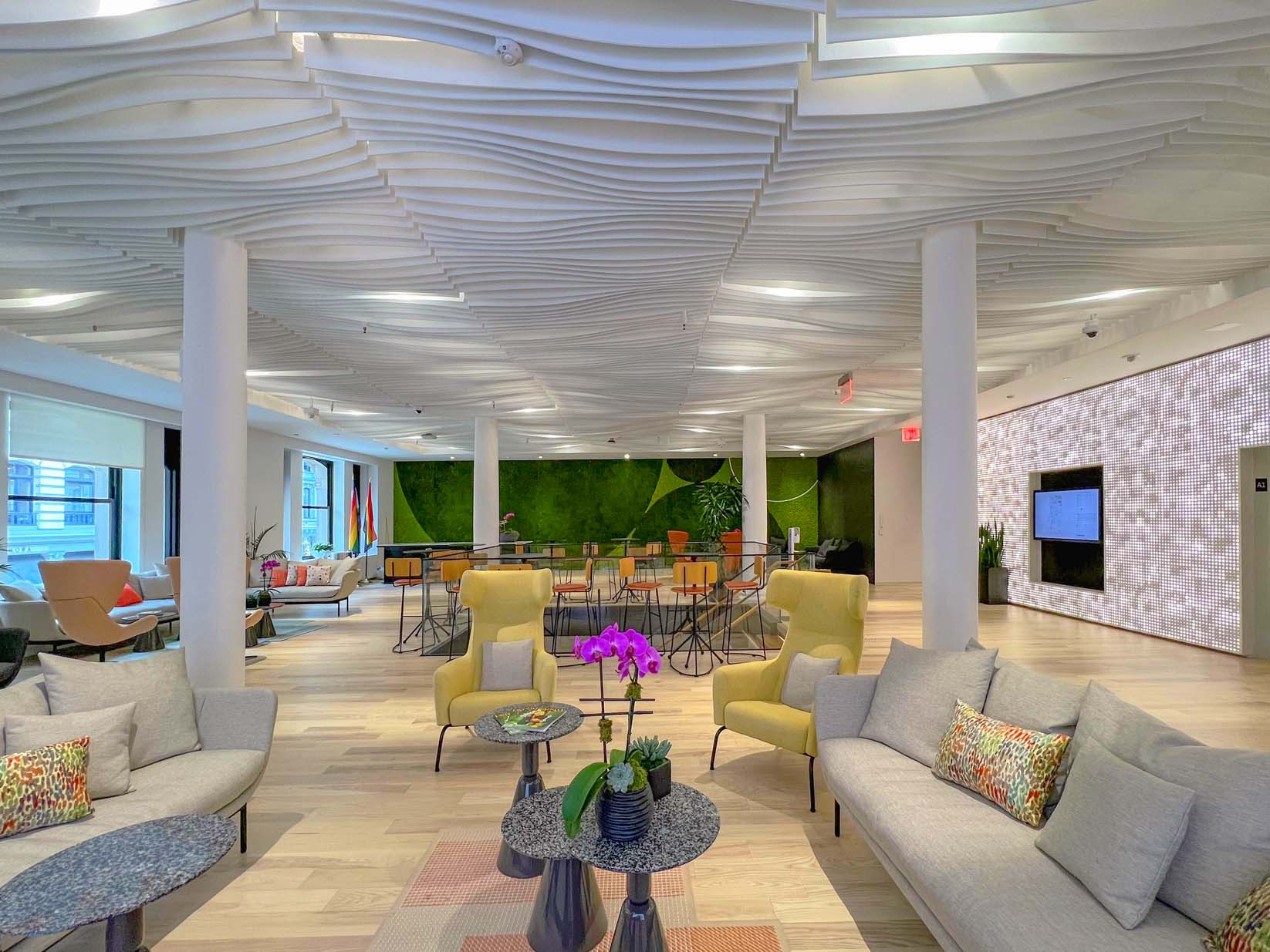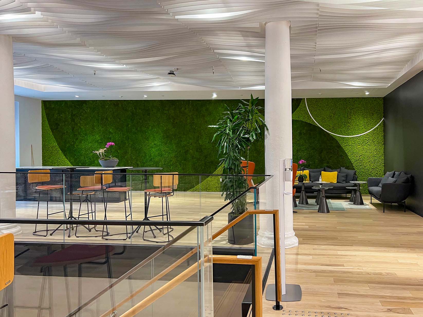 A Credit to Artistry & Installation Techniques! In the offices of this clinical stage biotech company’s offices, GOTW's lush, biodiverse installation in the lobby welcomes guests and employees, while also subtly dividing the space into functional areas. Replete with a bounty of forest and moss species in all-natural contrasting tones and rich texture, the garden not only brings vibrancy to the space, but also presents a compelling, abstract rendition of the company's logo, re-imagining the green arches of the artwork as biophilic waves full of movement and dynamic flow. As such, this attractive installation encapsulates the mission of the company while providing inspiration for these hardworking innovators searching for novel solutions to medical challenges.