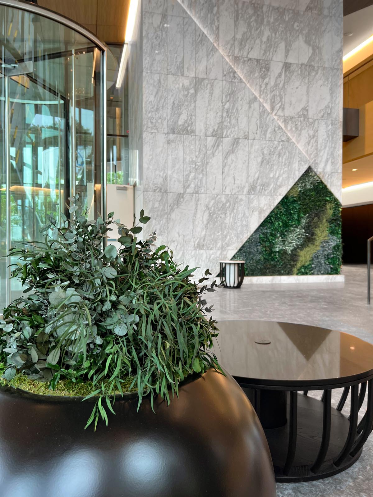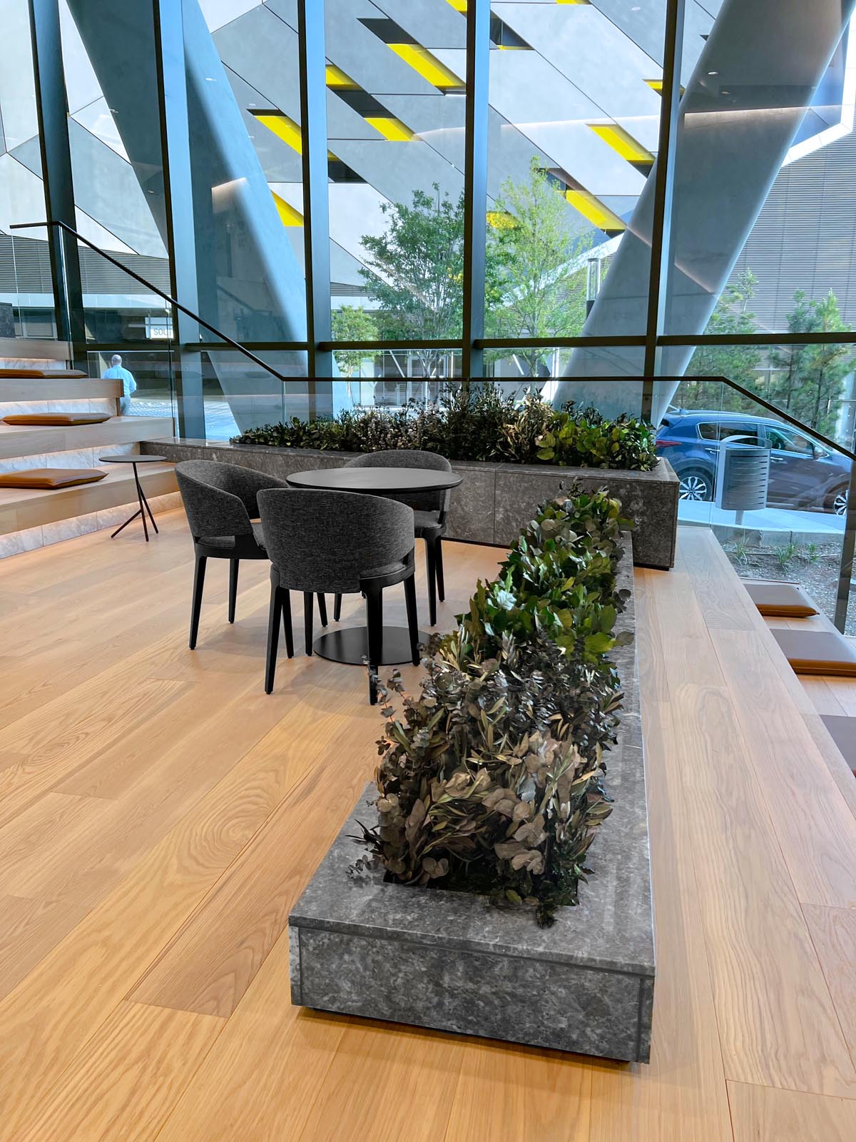 Bold Architecture & Biophilic Artistry Create an Exciting Workspace! At the Atlanta, GA offices of this national insurance giant, GOTW’s numerous installations range from low planter inserts to soaring gardens, spread over numerous levels and claiming a large area in the lobby. As such, GOTW’s multi-dimensional gardens bring this open space to life with greenery, offering contrast with the monolithic architectural elements. The planter inserts top off low natural stone walls and are placed on the multi-tiered stadium seating, while two geometric vertical gardens, one of them 17’ high, are integrated into the angular natural stone walls. Composed of forest, fern, and eucalyptus species, GOTW’s installations play off the hard, shining stonework with biophilic depth and texture, adding excitement to this already compelling and daring space where bold architecture sets the stage.